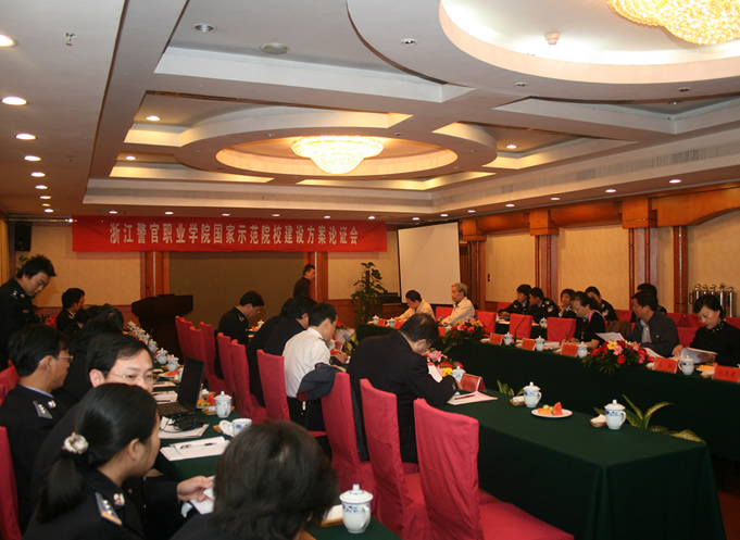 由浙江省教育厅和财政厅共同组织的浙江警官职业学院国家示范性高等职业院校建设方案论证会于2008年10月28日在杭州新新饭店举行。教育部高教司原副司长朱传礼、教育部教育研究中心副主任韩民、司法部法学教育指导处处长王红、宁波职业技术学院院长苏志刚、上海公安高等专科学校副校长许敏、浙江省教育厅高教处处长庄华洁、浙江工业大学原教务处长张达明、中国美术学院设备处处长胡惠君、浙江省教育厅雷炜等专家领导出席了论证会。