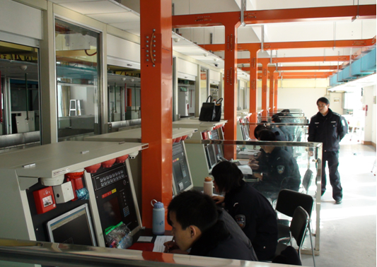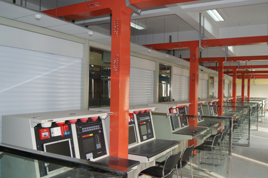 消防工程技术综合实训场设置在学院综合实训楼,分为实训教学车间、消防给水泵房、气体灭火装置机房及室外消防栓灭火训练场四个区域,建筑面积约800平方米。其中实训教学车间采用大空间厂房式布局,分为模拟火灾事故区、模拟火灾疏散区、消防控制室三部分。在模拟疏散区设置二十四个实训工位,在消防控制室设置实训指导工位,可一次性安排四十八名学生同时进行实训教学。