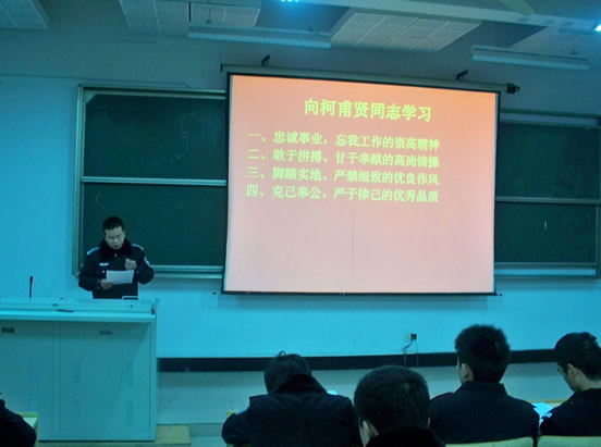 根据中共浙江省委政法委员会【2009】63号文件、浙江省司法厅【2009】199号文件及我院党委有关文件精神,2009年12月28日晚,安全防范系隆重举行柯甫贤同志先进事迹学习报告会,报告会由安全防范系团总支书记聂财勇主持,系学管干部、学生党员及入党积极分子200多人参加了报告会习。团总支书记聂财勇、大队长朱学强等同志分别从不同角度讲述了柯甫贤同志平凡人生背后不平凡的事迹,他从警23年,先后3次荣立个人三等功,获得9次个人嘉奖,多次被浙江省司法厅、浙江省委政法委等部门评为先进个人。