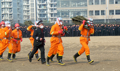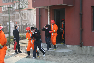 演习于12点50分正式开始,演习指挥部预设我院某学生宿舍(以田径场模拟建筑代替)4楼发生火灾,大部分学生被疏散出建筑,但火势难以控制并迅速向5楼蔓延,同时有多名学生被困火场,情况十分危急。参演队员接到指挥部命令,迅速有序赶赴现场救援,警戒组立即保护好现场,同时疏散组有序疏散建筑内被困学生,救援组进入火场救援受伤学生,灭火组和战斗组迅速扑灭火灾,救护组对伤员进行现场救护。整个演习过程持续了20分钟,参演队员的娴熟技能,引来了观摩领导和学生的阵阵喝彩。