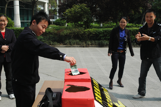 应邻里社区的邀请,4月24 日早上八点半,应用法律系团总支学生会的三名干部准时来到邻里社区,帮助社区制作了向灾区捐款的宣传海报,并和社区工作人员一起在社区内进行宣传发动。此次活动得到了社区居住者的大力支持,一位卖水果的老板表示这个活动举办的很及时,并捐出100元。老板还在纸上写下了“祝愿玉树人民明天生活更美好!”的祝福。还有一位小朋友,将自己口袋中的零花钱全部捐了出去。