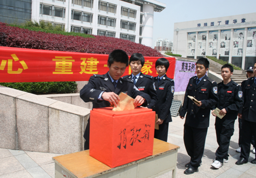 2010年4月29日中午12时,浙江警官职业学院安全防范系在院中心广场举行了“情系玉树,大爱无疆――捐出一份爱心,重建一个家园”的捐款活动,积极响应学院号召,向灾区人民献出一份爱心,伸出援助之手。此次活动由安全防范系团总支书记聂财勇同志主持,安全防范系大队长朱学强同志,07中队长俞琦同志,08队长朱柏松同志,09中队长邹志荣同志,09队长董瑞同志,以及安全防范系09级,08级全体同学参加了募捐活动。