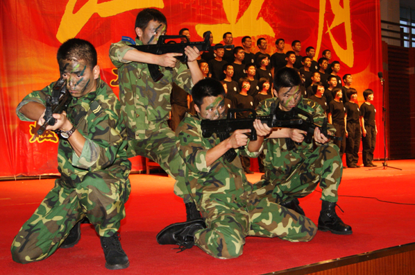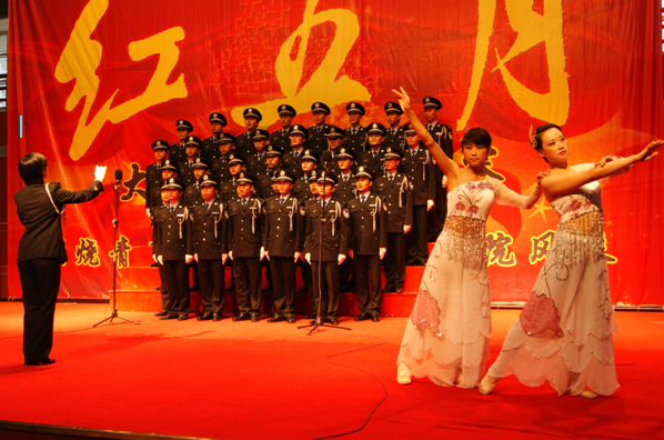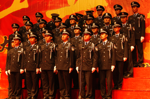师生献上一台精彩的演出。一首首富有时代气息、旋律优美、内容积极向上的歌曲响彻校园。安防系08中队的《爱我中华》深切表达了对祖国的无比热爱。试点监管091的《战士就该上战场》再现了军人的热情豪迈,信安091区队的《精忠报国》表达了警院学子报效祖国的万丈豪情,试点法警094区队带来的《当你的秀发抚过我的钢枪》激情澎湃,令人动容,将演出推向高潮。