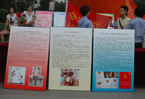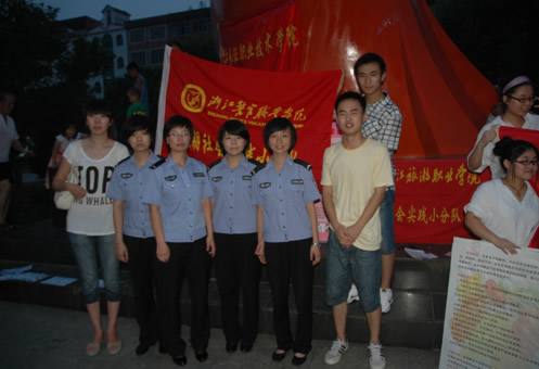 此次活动,由来自多个不同院校的学生共同参加。各个院校的同学,都进行了具有学校特色的宣传,比如:假币鉴别,食品安全,西湖申遗等,还有医学院的同学为当地群众进行免费的血压测量。我院是一所司法院校,法制宣传是我们的特长,所以应用法律系的宣传人员发挥专长,进行了一次法制宣传活动。同学们精心准备了宣传法律知识的小册子,分发给桐琴居民,并制作了宣传板,内容主要涉及《刑法》、《刑事诉讼法》、《治安管理条例》、《未成年人保护法》等与日常生活密切相关的法律知识。期间有不少当地村民前来向宣传人员咨询法律问题,同学们运用所学所知知识为村民进行了一一解答。