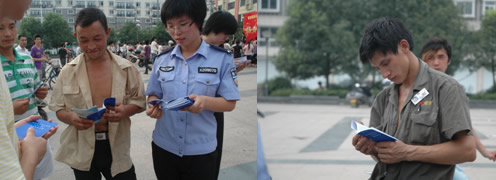 (法制宣传人员向村民分发宣传册,村民认真阅读)