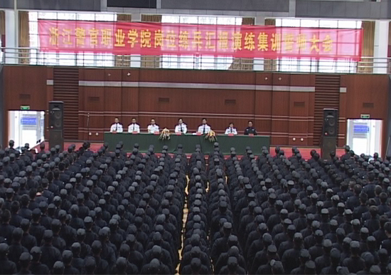 10月11日,浙江警官职业学院千余名师生齐聚警体馆,举行了庄严的岗位练兵汇报演练集训誓师大会。师生们群情振奋,斗志昂扬,铿锵的誓言表达了师生们圆满完成汇报演练集训任务的坚定决心和信心。周祖勇、黄兴瑞、张平、钱美兰、周国新等院领导和学生处、警训部负责人出席了誓师大会。