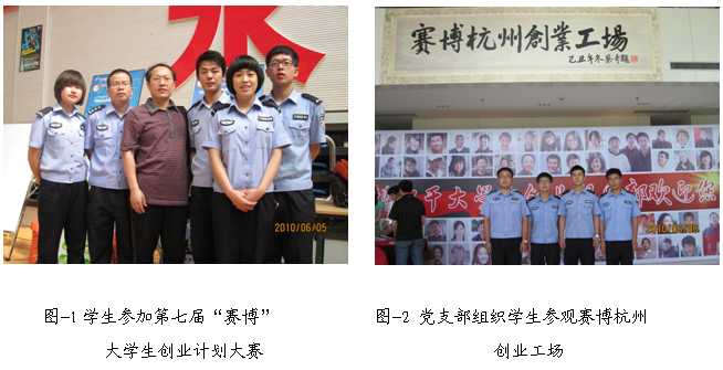(1)2010年5-6月,学生党支部开展“安防科技”创业项目设计大赛活动,征集到各团支部创业计划21份,评出了4项优秀项目,并组成7人小组,参加了浙江省第七届“赛博”大学生创业计划大赛,其中“杭州消防设施维护有限公司”项目获得团队二等奖。同时,党支部组织21名党员参观了杭州赛博大学生创业工场,并与杭州知名企业洽谈了项目成果转化方面的问题。党支部通过组织学生参加创业计划大赛等活动激化学生创业热情,指导学生创业方法,取得良好成效。