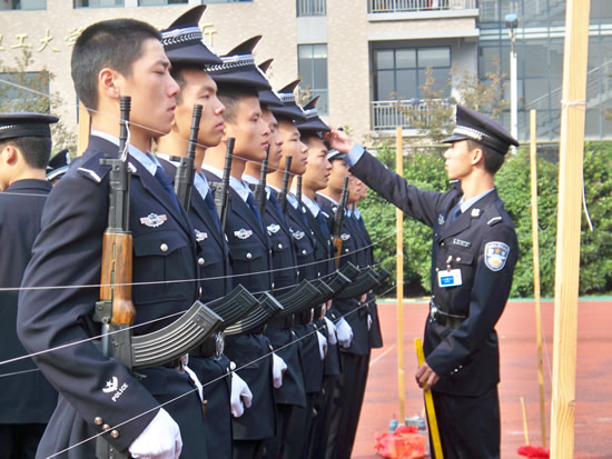 同一个频率,同一个动作,那种默契并不是与生俱来的。看着这些坚实有力整齐的步伐,就知道他们倾注了多少的汗水。脚上的沙袋、后背的十子架和顶在头上的砖,成了他们每天的伴侣。教官一声声坚定有力的命令让他们不能有丝毫懈怠。脖子酸过,腿抽筋过,因为脚点地被教官罚过。但没有一个人喊苦喊累。每天绑着沙袋练习数百遍的踏步和正步让他们的脚踝磨破了。看着袜子上还未干的血迹,教官心颤了,来视察训练进度的领导心也颤了。可是什么样的困难都挺过来了,还有谁会说放弃呢!他们仍然从容的进行着训练。用行动诠释着他们的责任。他们是真正的好男儿,是安防系的英雄。