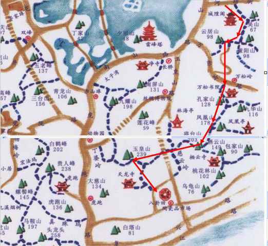 二、登山线路:吴山广场(8:00出发)―吴山―云居山―万松书院北面―凤凰山―栖云山―玉皇山(吃饭)―八卦田