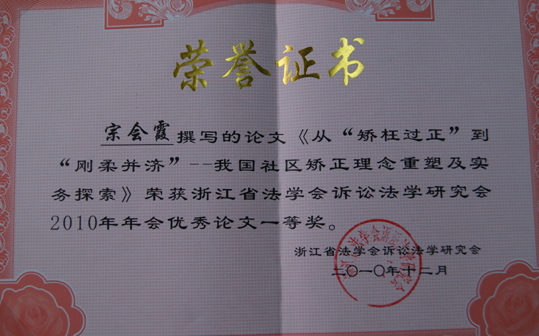 此次年会主要探讨了证据规定、法院调解、检察制度和司法现代化等诉讼法学领域的热点、难点问题,年会还对与会代表提交的45篇论文进行了评比,经过浙江省法学会诉讼法学研究会组织专家评审,年会共评选出优秀论文一等奖5篇,二等奖7篇,三等奖12篇,我院应用法律系宗会霞老师撰写的论文《从“矫枉过正”到“刚柔并济”-----我国社区矫正理念重塑及实务探索》荣获优秀论文一等奖,该论文主要从以下三个方面论述了应在继承与发展柔性矫正措施的基础上,梳理与完善刚性的矫正措施体系:一、现实考证:我国社区矫正的现状及方向偏差;二:价值诉求:社区矫正惩罚性与帮教性并重的改造理念;三:路径探寻:“刚柔并济”社区矫正模式探索。