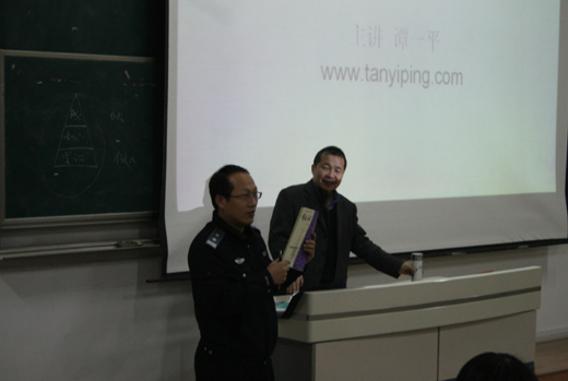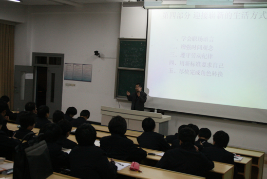 谭老师将自己的讲座分为六个部分,从“白领的含义”、“学生变为白领的意义”和“白领与学生的区别”等角度诠释了他对白领这个职业的理解。谭老师的讲课方式别具一格,他将常识、知识、胆识分别作为白领业绩获得成功的金字塔底层、中层和顶层,着重强调做人的常识是成功的基础,而拥有胆识才能成为最拔尖的精英人才。谭老师还指出,同学们自己要成为自己的导师,高标准要求自己,要有强烈的上进心,制定一个切合实际的理想,同时又要勇于大胆尝试,尽快地完成从学生到白领的角色转换。谭老师幽默风趣的语言还不时引起同学们的阵阵掌声和笑声。讲座最后的互动交流阶段,同学们踊跃发言,积极提问,谭老师一一耐心地作出了回答。
