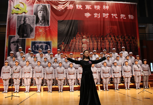 演出在嘹亮的《新四军军歌》声中拉开帷幕,身着新四军军服的合唱团的演员,以饱满的精神,雄浑的歌声,充分演绎了新四军战士勇往直前、不怕牺牲的铁军精神,使现场的1000多名师生心灵感到震撼。