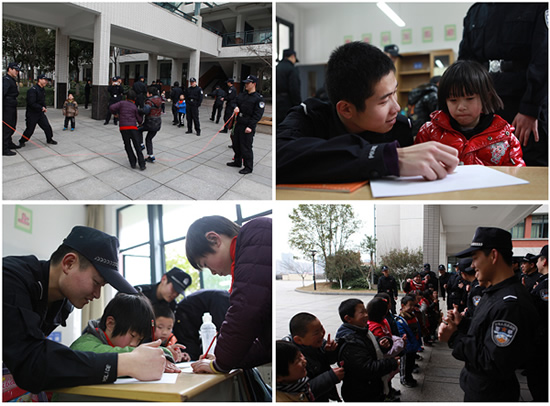 13:00时,慰问队员们踏着整齐的步伐走进杭州市聋人学校。迎接队员们的是聋人学校一年级一班的小朋友和他们的老师。慰问队员们把爱心练习本、铅笔和糖果饼干等慰问品赠送给小学生代表;以队伍会操的形式向小朋友们展现了警院学子英姿飒爽的警察形象,博得了小朋友们的阵阵掌声和欢笑;慰问队员们用纸和笔与孩子们沟通,与他们一起画画、写字,没有声音的沟通传递着警官学子的爱心和孩子们的感激之情;队员们还与小朋友们一起做游戏,一起跳绳,一起踢毽子,一起拍照留念,队员们和孩子们的欢笑声连成一片。小朋友们则教会了队员们简单的手语,如“向雷锋同志学习,谢谢哥哥姐姐”。