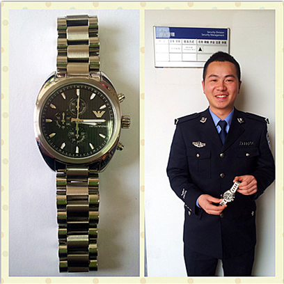 3月22日,我院校卫队员王小波在学院警体馆篮球场巡逻时捡到一块手表,即毫不犹豫将表上交到保卫处。 3月27日,手表失主,一大队11级学生吴某到保卫处认领手表。通过了解,此手表系该生从香港购买的意大利阿玛尼牌的名贵手表,价值人民币三万元。 据统计,保卫处校卫队员及新宇公司楼长、保洁员,去年一年共捡到并上交失物140多件,估值达14万元以上。 对王小波这种拾金不昧的雷锋精神,我们要宣传和弘扬。同时我们也希望涌现出更多的王小波式的好同志。