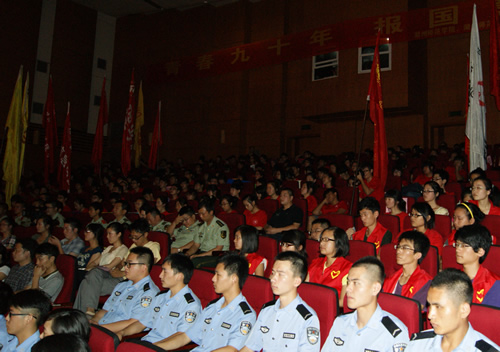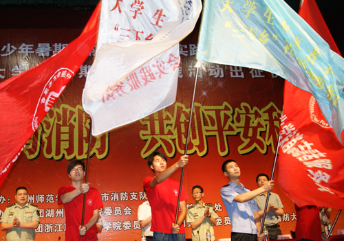 为推动消防宣传社会化进程,鼓励青年大学生投身社会主义精神文明建设,动员全社会力量积极参与到查找火灾隐患行动中,为党的十八大胜利召开营造良好的消防安全环境,2012年7月5日,共青团浙江警官职业学院委员会联合湖州师范学院、湖州市消防支队、共青团吴兴区委在湖州市师范学院音乐厅召开了青少年暑期消防安全教育实践活动启动仪式暨2012年大学生暑期社会实践活动出征仪式。