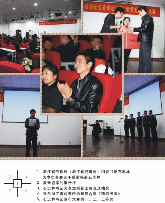 晚六点,报告厅已座无虚席。晚会邀请到了浙江省劳教局(浙江省戒毒局)团委书记石志林以及来自浙江警察学院的嘉宾,大家齐聚一堂,观看歌咏大赛。