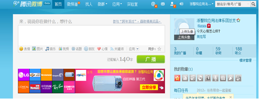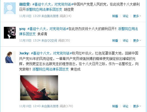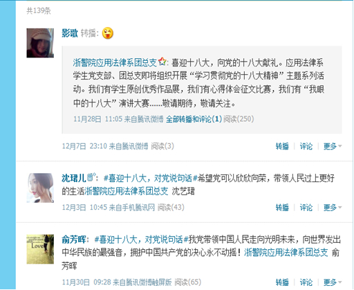 为保证此次活动的顺利开展,应用法律系指定专职人员对 “浙警院应用法律系团总支”官方腾讯微博账号和“应用法律系团总支”新浪互动微博账号进行统一管理,以保证网络互动平台的正常开展,并在此基础上及时发布和更新关于学习十八大精神的动态信息。活动中,应用法律系各年级、试点班和阿克苏中队学生积极关注微博,踊跃发言,并与应用法律系团总支互动交流十八大内容,表达了对党、对祖国和对十八大的美好祝愿,倾述内心无比激动的心情,以自己的实际行动向党的十八大献礼。十八大已成为微博上的一个热点。