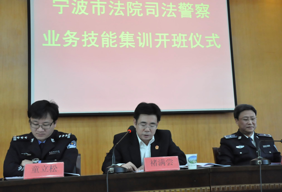 褚委员在仪式上做了动员讲话。他指出,最高人民法院周强院长及新一届党组对司法警务工作高度重视,提出了“打牢基础、破解难题、狠抓规范、确保安全”十六字总体思路;浙江省高级人民法院领导强调要进一步加强警务知识学习,积极开展技能训练,提升法警的执法能力;浙江省总队领导也强调要抓好专业技能培训,切实提高司法警察执法履职能力,并对学员强调了4点要求,一要勤学苦练,二要严守纪律,三要树立安全第一理念,四要互助互学。希望大家以“干在实处、争创一流”的要求来规范自己,争取共创佳绩。宁波中院法警支队副支队长宣读了集训纪律和有关要求。