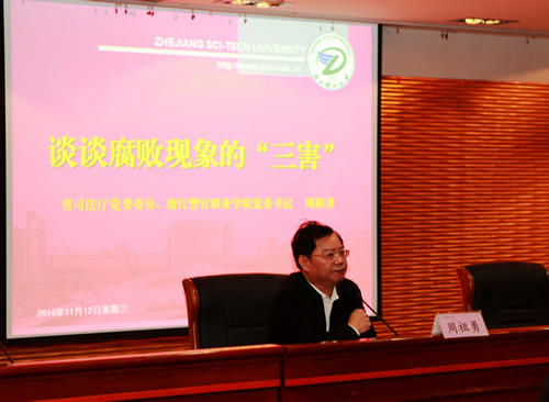 周祖勇书记以《谈谈腐败现象的“三害”》为主题,为学员们做了首场报告。他指出,腐败现象是当今世界的最大公害,是和平时期对共产党的最大伤害,是现阶段对官员的最大危害。高校领导干部要牢固树立依法治国理念,习惯于站在群众立场上做事,习惯于在媒体的聚焦下说话,习惯于在法制的轨道上履职,习惯于在社会的监督中工作。周书记的报告高屋建瓴、旁征博引、内容丰富、信息量大,具有很强的理论性、实践性和指导性,对领导干部进一步提高廉洁自律思想认识、加强反腐倡廉建设具有重要指导意义。