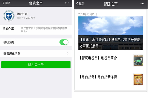 学院电视台警院之声微信平台(微信号:ZJJYTV)于2014年10月11日正式启用。从成立初期不到一百人关注,到现在拥有固定关注用户近3000人,警院之声凭借其快人一步的资讯、专业深度的剖析、精美绝伦的图片吸引了大量用户,从而一步一步逐渐发展起来。秉承着倾听警院声音、关注警院动态、传递警院精神的宗旨和理念,警院之声致力于将平台打造成一个高效、便捷、服务于大众的平台,并将最新鲜、最热门的动态第一时间传递给每一位用户。