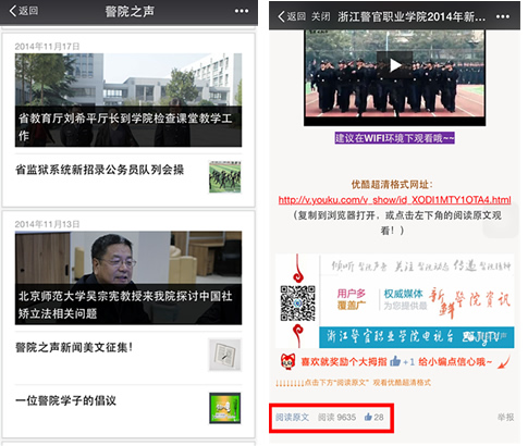 同时警院之声时刻关注警院的动态,2014年11月11日,《北大吴宗宪教授来我院探讨关于中国社区矫正立法相关问题》、14日《省教育厅刘希平副厅长来我院视察》、22日《浙江省检察机关司法警察大练兵暨司法警察培训基地揭牌仪式在我院举行》等学院重大事项均被平台发布,引起了