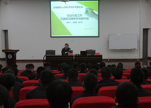 为迎接30周年校庆,科研处策划组织了系列学术报告活动。近日,省司法厅党委委员、学院党委书记、研究员周祖勇在学院报告厅为师生作了题为“司法行政工作在国家治理体系中的作用”的首场学术报告,刑事执行、监狱信息技术应用、社区矫正、法律事务等相关专业的师生认真聆听了周书记的精彩报告。