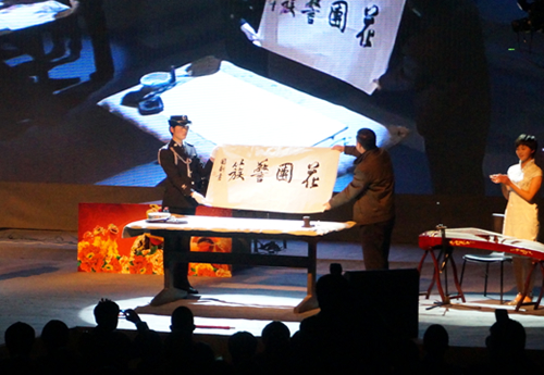 晚会在悠扬的古筝声中拉开帷幕,学院政治部周国新主任、校友赵夫生先生挥毫泼墨,表达对学院美好的祝福。