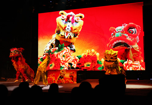 舞狮表演《狮舞警苑》把舞狮与醉拳融合在一起,俩头雄狮时而顽皮可爱,时而憨态可掬,神气十足,赢得阵阵掌声。
