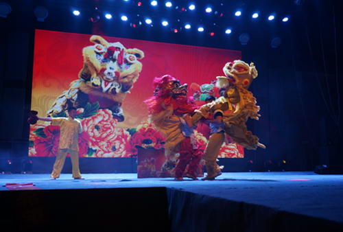 舞狮表演《狮舞警苑》把舞狮与醉拳融合在一起,俩头雄狮时而顽皮可爱,时而憨态可掬,神气十足,赢得阵阵掌声。