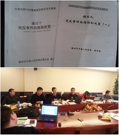 12月8日―11日,警体部杨林教授、林佳东老师前往省高院参加“全省法院司法警察规范执法系列教案”点评工作,针对“法院突发事件现场处置”教案,林佳东老师提出了处置的原则和处置过程中技能应用的方法,杨林教授就“教案”的规范性和技能操作针对性提出意见,指出教案的落脚点和训练受体是广大基层一线民警,动作技能一定要简单、实用、有效。会上杨林教授还简单地介绍了主编最高院政治部、警务部组织的《人民法院司法警察训练教程》一书情况。