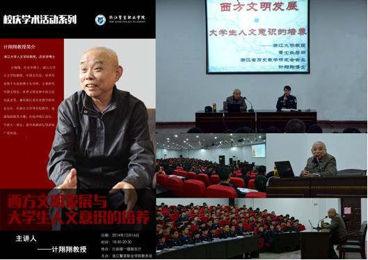 12月16日晚6时,在学院报告厅举办了系列讲座的第二场,讲座邀请了浙江大学“四大名嘴”之一――人文学院博士生导师计翔翔教授,主题为“西方文明的发展与大学生人文意识的培养”,应用法律、安全防范和信息技术与管理等三个系同学聆听了讲座。