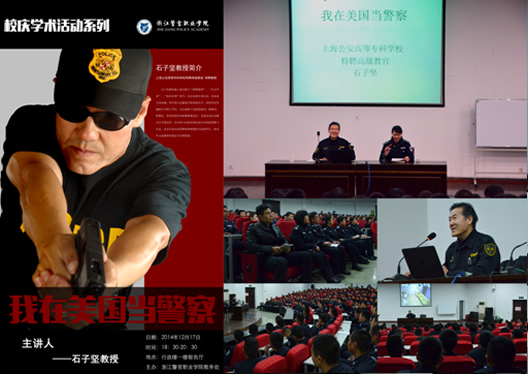 12月17日晚6时,在学院报告厅举办了第三场讲座。讲座主讲人是上海公安高等专科学校特聘高级教官、海外名师石子坚教授,他曾在美国监狱局、警察局、特警队就职,他主讲的题目是“我在美国当警察”,以刑事司法系为主的部分师生聆听了讲座。