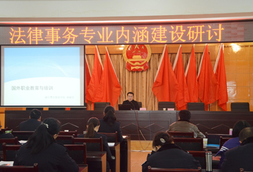 本次考察交流行程分两个阶段。在专业建设经验介绍阶段,考察团成员介绍了我院法律事务专业在国家示范专业、省特色专业和省优势专业建设过程中积累的经验,特别是法律事务专业在专业内涵建设方面取得的成果。闵敢教授作了题为“法律事务专业建设及改革探索与实践”的报告,胡晓军副主任作了“精品课程及资源共享课程开发与实践”、“法律事务专业实践教学与职业技能考核建设”以及“境外职业教育的启示”的报告。在交流研讨阶段,双方就专业定位、兼职教师机制建设、社会服务和课程建设展开讨论,同时也就法律事务专业建设中存在的问题、困境进行了深入沟通。