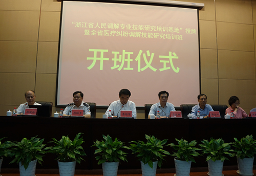 5月18日,“浙江省人民调解专业技能研究培训基地”授牌暨全省医疗纠纷调解技能研究培训班在我院隆重开班。省司法厅党委委员、副厅长吉永根,省人民调解协会会长、省法协会副会长季培军,省司法厅党委委员、学院党委书记周祖勇,省人民调解协会常务副会长韩麦田,省人民调解协会副秘书长洪慧萍出席了开班典礼。省人民调解协会秘书长陈俊伟主持开班典礼。