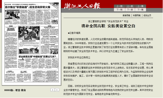 5月28日,《浙江工人日报》“职业•教育”版、“职校牛专业”栏目以《浙江警官职业学院安全防范技术专业填补全国高职安防类设置空白》为题,报道了安全防范技术专业多年来的建设成果。