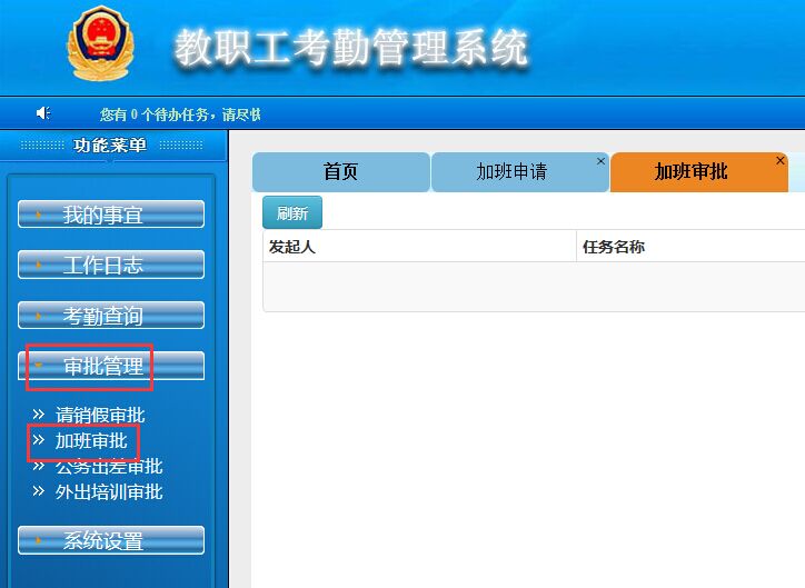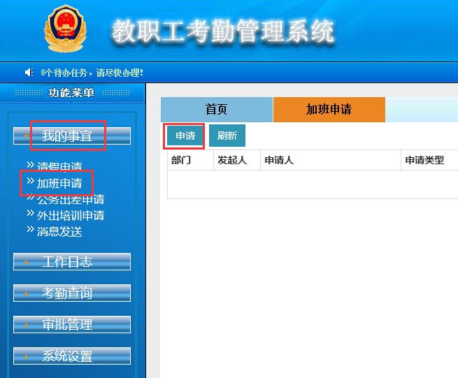 院属各部门: 根据学院请销假制度的规定,现将暑期加班的流程作如下说明: 进入学院协同办公网,点击考勤管理系统: 加班申请人(进入学院教职工考勤管理系统,【我的事宜】――【加班申请】): 要求: 1、按照“凡是加班必须申请”的原则,必须在考勤系统中提出个人申请,并填写加班理由和事项(可附通知或加班计划) 2、认真填写工作日志,以备审查。 加班审批人(进入学院教职工考勤管理系统,【审批管理】――【加班审批】): 要求:及时审批加班人的申请,并负责加班人员的加班情况的审核和检查。