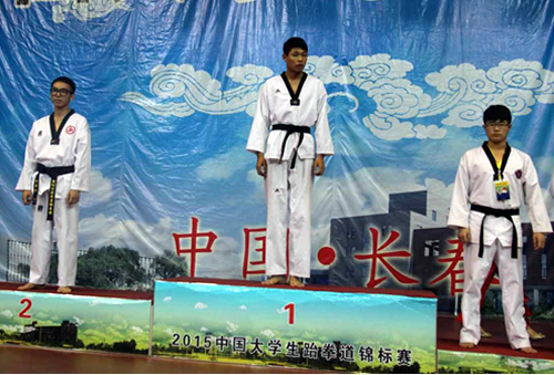 近日,在2015全国大学生跆拳道锦标赛中,我院信管系2013级李洪柱同学顽强拼搏,奋勇当先,荣获80KG级别全国冠军,展示了我院学生过硬的体能和运动水平,为学院挣得了荣誉。(李洪柱同学在领奖台上) 参赛以来,李洪柱同学在教练员的指导下,勤奋训练,努力提高自己跆拳道技战术水平。比赛中,他不畏强手,沉着冷静,一路过关斩将,最终将85KG级全国冠军收归囊中。 李洪柱是信管系网络技术专业131区队学生,品行优良,意志坚强,训练刻苦,是优秀学生干部和入党积极分子。