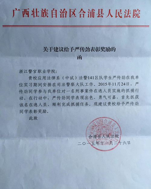 各级法院对我院法警实习学生给予了充分的肯定,对学院的培养工作给予了高度的评价,普遍认为我院培养的中政委试点学生素质高、业务技能精,岗位适应性强,工作上手快。尤其是在广西合浦县法院法警大队实习的法警(中试)141区队严传劲同学,实习期间参与对一名刑事案件在逃人员的抓捕行动,在行动中,严传劲同学表现出色、勇气可嘉,首先抓捕了该名在逃人员,顺利完成抓捕任务,法院专门来函建议我院对严传劲同学进行表彰奖励。