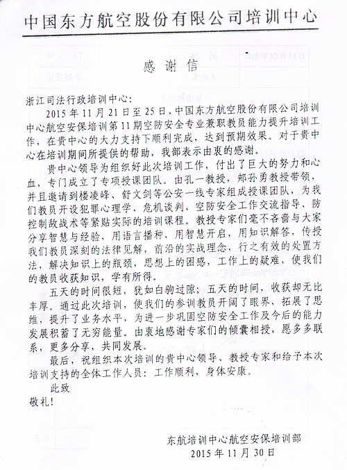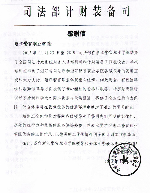 近日,司法部计财装备司、东方航空公司培训中心分别在学院举办了全国司法行政系统财务人员培训班暨计财装备工作座谈会、航空安保培训第11期空防安全专业兼职教员能力提升培训班。培训工作结束后,两家培训单位分别发来感谢信,对学院精心组织、细致周全的服务保障工作,以及精心安排的高水平培训教学团队、教学课程,表示了衷心感谢。