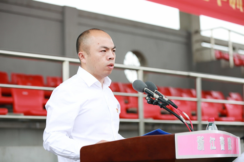 10月9日下午,浙江警官职业学院隆重举行2019级新生军训成果汇报暨开学典礼。省司法厅党委委员、院党委书记顾金法,院党委副书记、院长张福成,院党委委员、纪委书记钱美兰,院党委委员周国新,院党委委员、副院长严浩仁,院党委委员、政治部主任杜风雷出席。张福成院长作致辞讲话,特邀嘉宾安吉县天荒坪镇党委委员、余村党支部书记汪玉成作毕业生代表发言。