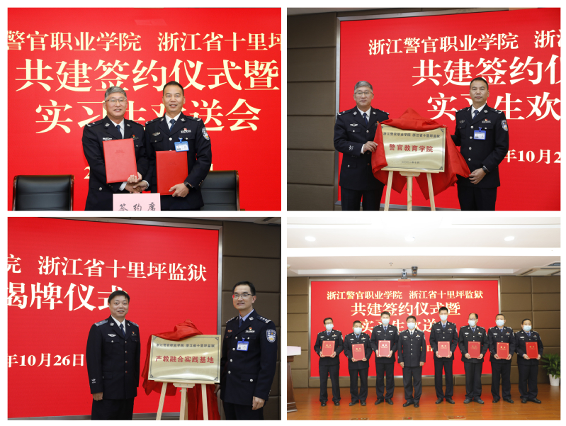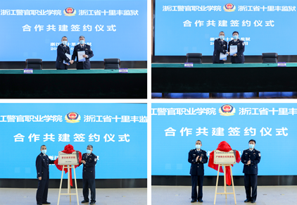 三家监狱单位高度重视本次合作共建工作。在省十里丰监狱,陈红良指出,要积极构建合作发展新平台、新机制,努力打造监校合作的示范标杆。双方还签订了“服刑人员智能心理分析研判系统”项目的研究与试点合作协议。在省十里坪监狱,羊伟杰提出,要紧扣合作内容,实现优势聚合、共赢发展。对我院学生在疫情防控期间发挥的积极作用予以充分肯定,并举行聘任兼职教官、实习生欢送仪式。在省金华监狱,斯方南强调,共同创建高水平专业化实训基地的条件已经成熟,要全力打造产教融合实践基地“金监样板”。为表达省金华监狱前期对我院参加全省高校教学能力比赛给予大力支持的感谢,学院向省金华监狱赠送了锦旗。