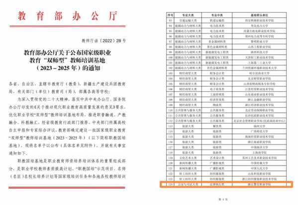 近日,教育部发文通知,经浙江省教育厅推荐、教育部评审,学院牵头建设的“双师型”培训基地,成功入选国家级职业教育“双师型”教师培训基地(2023-2025 年)建设单位,是公安与司法大类专业唯一入选单位。