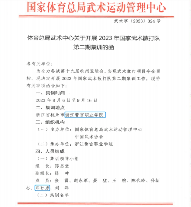 为全力备战第十九届杭州亚运会,实现武术散打夺金目标,国家体育总局武术运动管理中心和学院培训机构经过前期紧张的调研考察和沟通,确定我院为国家武术散打队亚运备赛第二期集训地,学院安全防范系郏孙勇教授入选本期集训领导小组。国家散打队于8月6日顺利进驻我院,澳门散打队也紧随其后,申请加入集训。