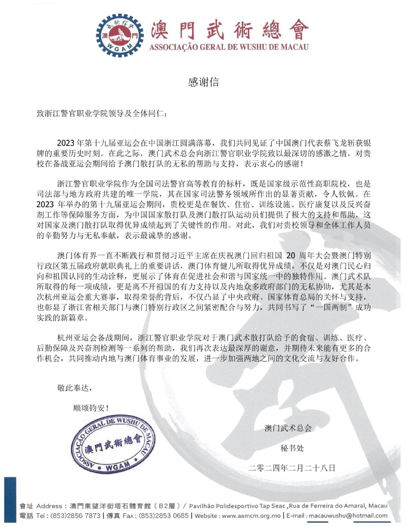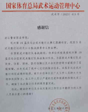 新学期伊始,学院相继收到国家体育总局武术运动管理中心、澳门武术总会发来的感谢信,对学院在国家散打队和澳门散打队备战2023年第19届亚运会期间给予的大力支持表示感谢。 感谢信中,国家体育总局武管中心对学院积极承接备战集训任务的态度表示肯定;对学院给予国家散打队在食宿、场地、医疗保障、兴奋剂防控等方面提供的坚强保障表示赞扬;国家队参赛的5名运动员能够以全胜战绩勇夺5枚金牌,离不开学院的鼎力支持及相关工作人员的辛勤付出,并对此表示衷心感谢。 澳门武术总会高度评价学院为澳门散打队在备战集训期间提供的各项优质保障,为澳门散打队夺得1银的优异成绩起到了关键作用,希望未来能有更多机会加强两地之间的文化交流和友好合作。 承接亚运备战集训工作,是对学院开展高层次、高水平、高要求培训的一次全方位考验。在45天的备战集训过程中,学院领导指挥有方,培训机构、后勤处、警训部和保卫处等多部门协调配合,全体参与人员辛勤工作、无私奉献,圆满完成了国家散打队和澳门散打队的保障工作,展现了学院在国家和人民有需要的时候,召之即来,来之能战,战之能胜的大局意识和责任担当。 |