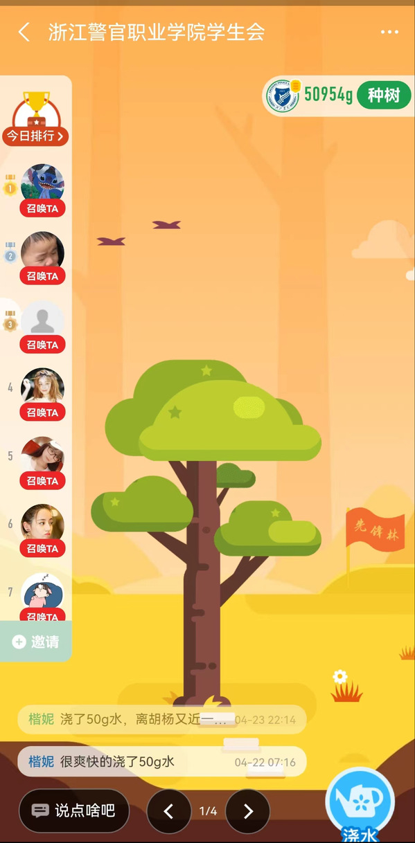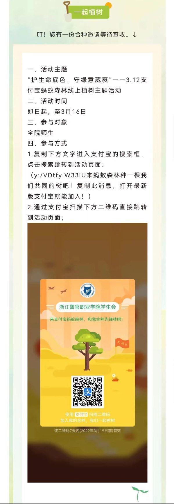2022年3月12日,由于疫情影响,学院将线下种树改为线上种树,通过微信公众号以及支付宝蚂蚁森林平台,发起“护生命底色,守绿意葳蕤”线上种树,让更多的同学参与到种树护绿行动中来。